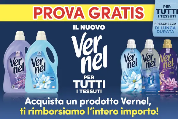 Per partecipare, ti basterà acquistare un prodotto qualsiasi a marchio Vernel, a tua scelta, in base alla disponibilità del punto vendita. La promozione è attiva su tutto il territorio nazionale italiano e nella Repubblica di San Marino. Puoi effettuare l’acquisto in qualsiasi punto vendita fisico che esponga il materiale promozionale dell’iniziativa. Sono validi anche gli acquisti effettuati su siti di e-commerce, a condizione che siano riconducibili a punti vendita fisici presenti sul territorio (ad esempio, il servizio di spesa online di un supermercato).