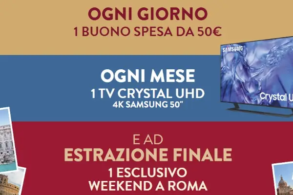 🏆 Premi in palio: Il montepremi complessivo è di 13.844€ (IVA inclusa). Tra i premi Instant Win ci sono Buoni Spesa digitali da 50€ e TV Samsung Crystal UHD 50”. Il premio finale consiste in un voucher per un weekend a Roma per due persone! Inoltre, per ogni prodotto acquistato riceverai un buono sconto da 0,40€.